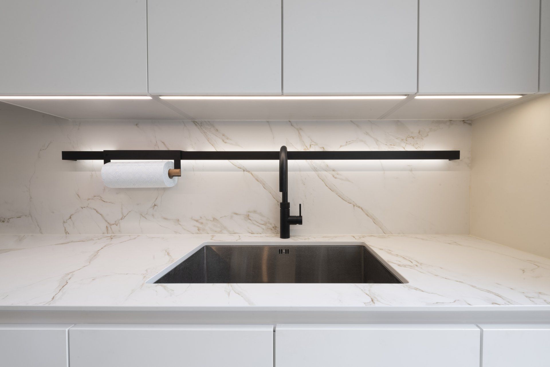 We took a monochrome approach to the design of the kitchen, adding a unique double edge on the kitchen island.